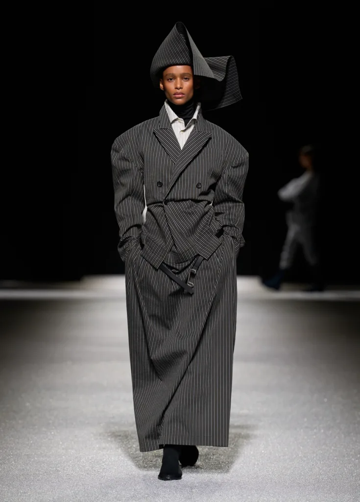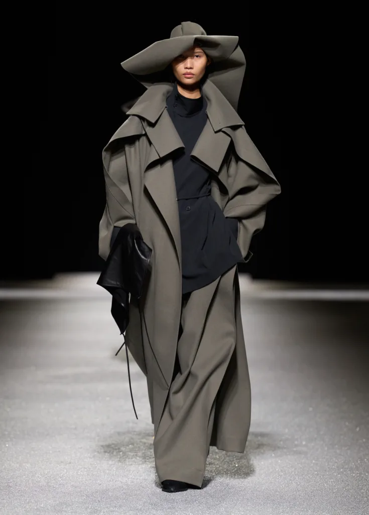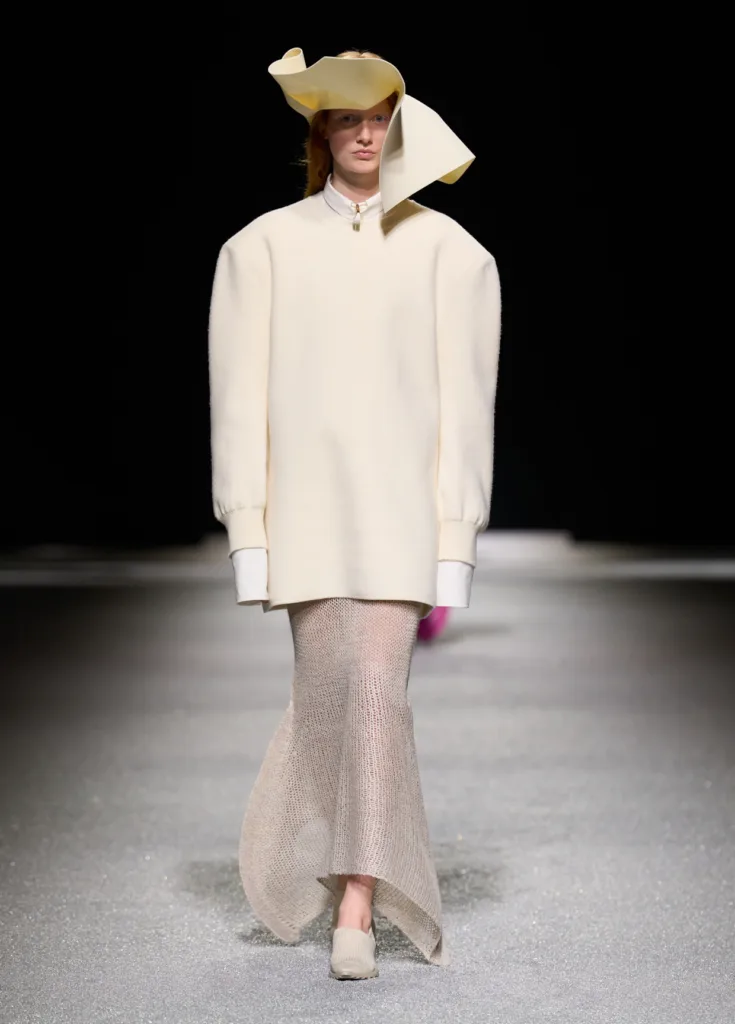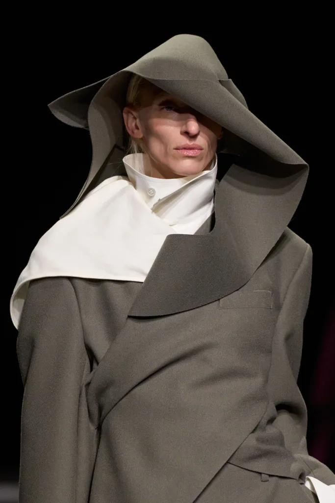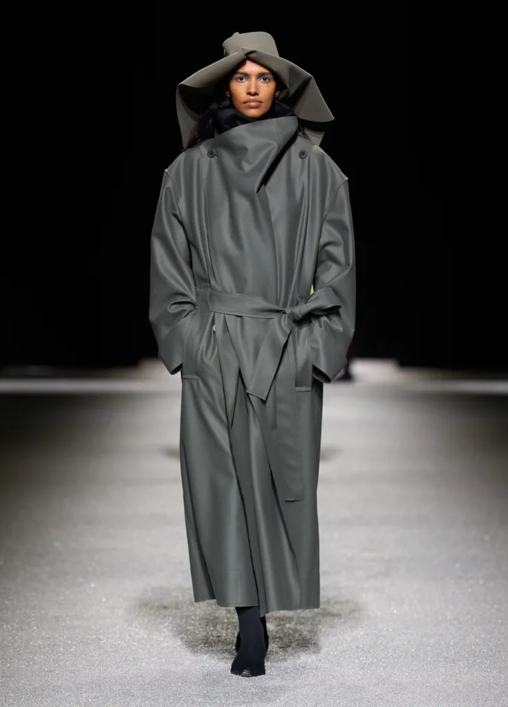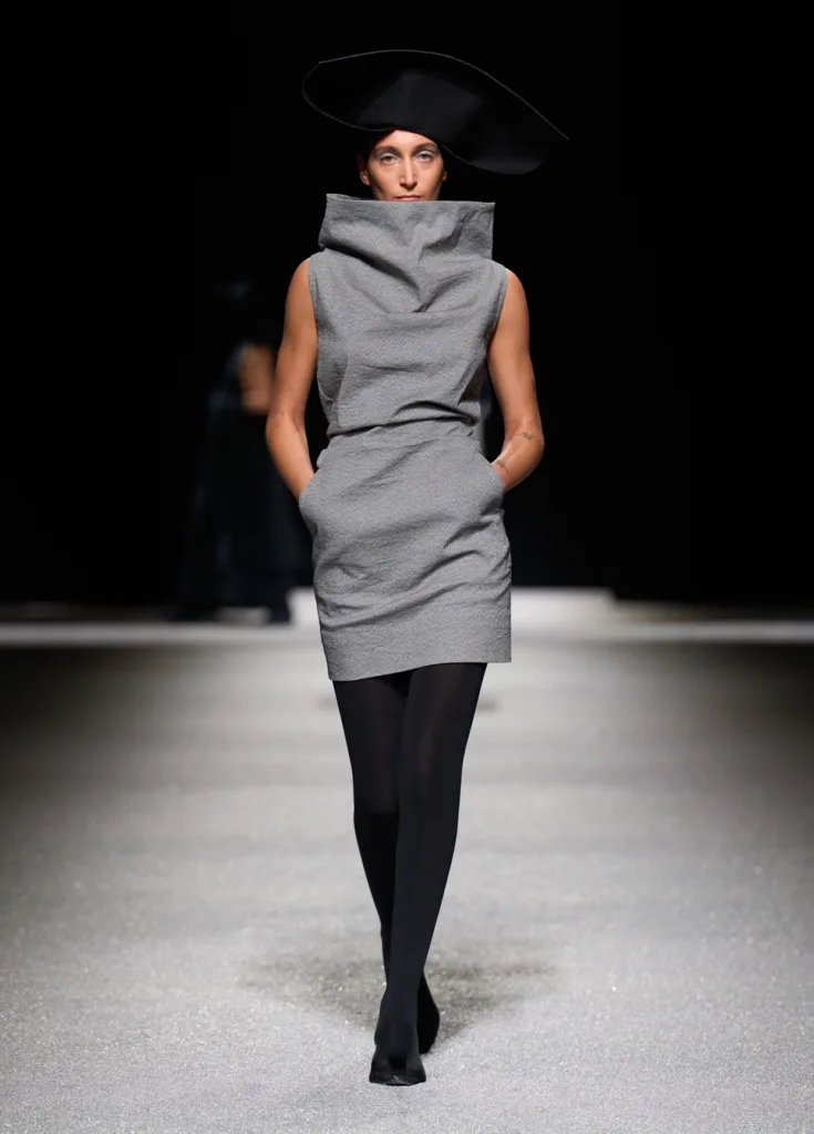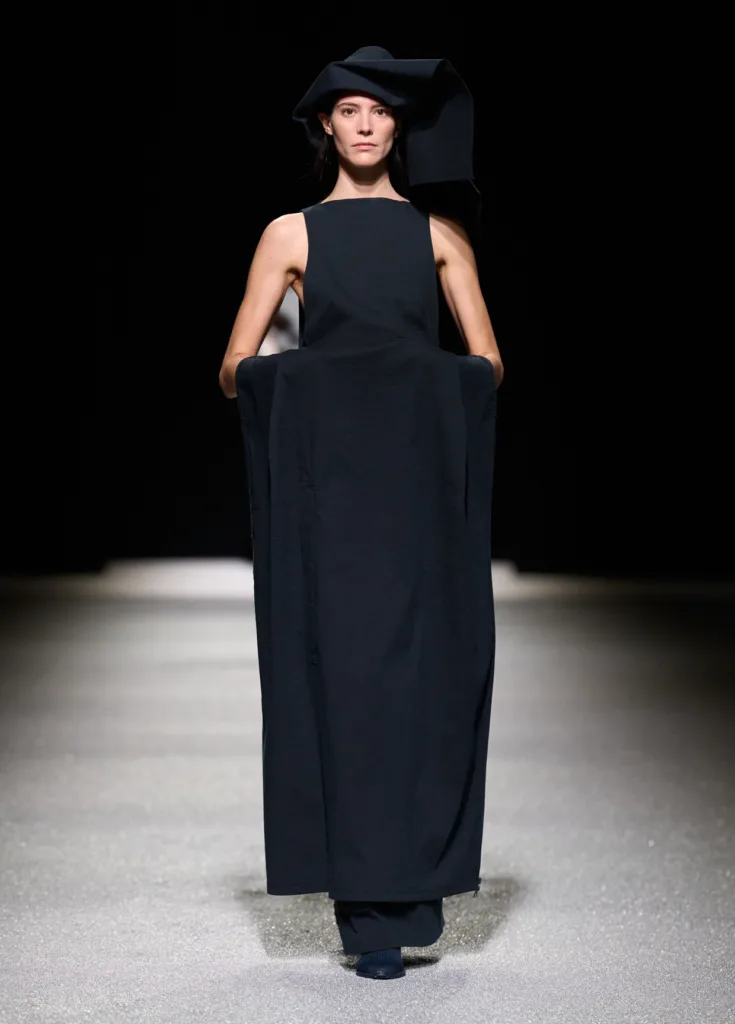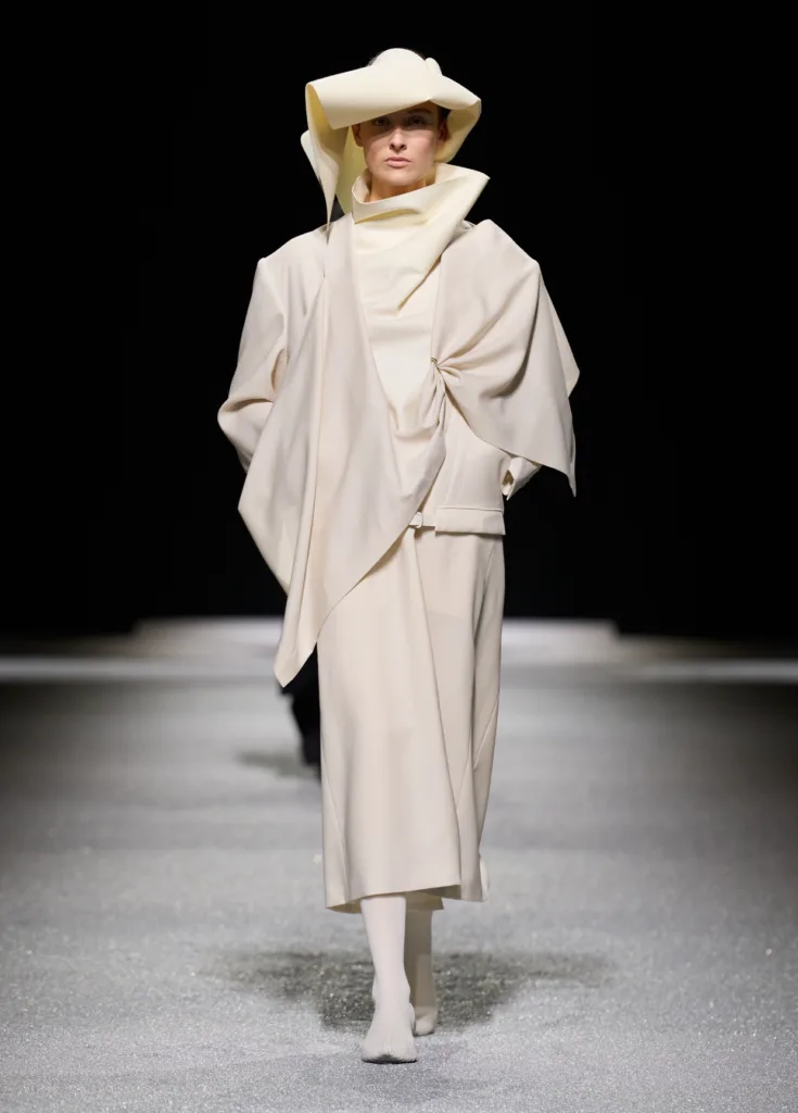 The collection is about letting go of the desire to maintain control throughout a creative process and "allowing" to leave things open and unfinished. Simply twisting and folding a sheet of bonded wool, each bespoke headpiece was created with bare minimal design intervention, only to the extent of framing the beauty found in the materiality as worn on the human body.